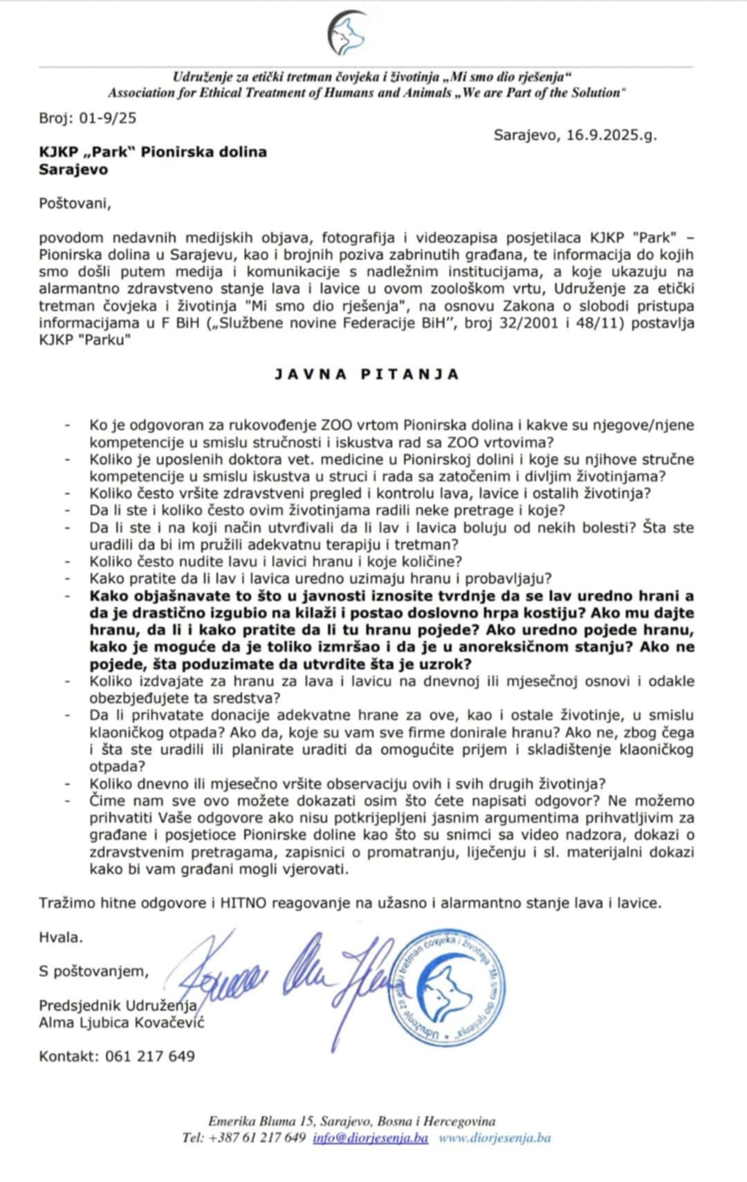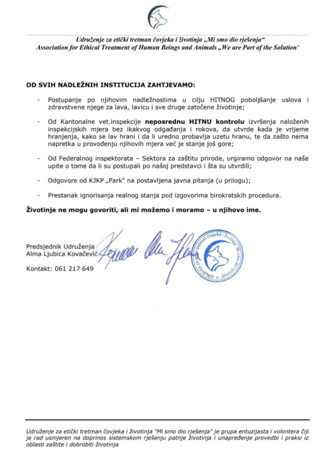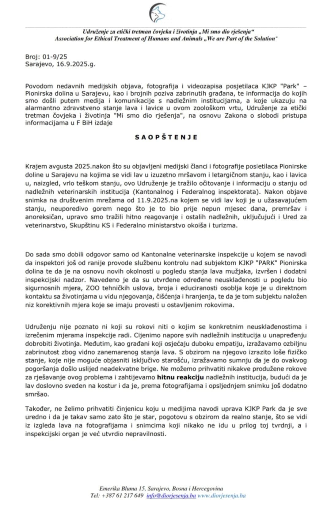 Povodom nedavnih medijskih objava, fotografija i videozapisa posjetilaca KJKP “Park” – Pionirska dolina, kao i brojnih poziva zabrinutih građana, Udruženje za etički tretman čovjeka i životinja „Mi smo dio rješenja“ uputilo je zvaničan upit KJKP „Park“.